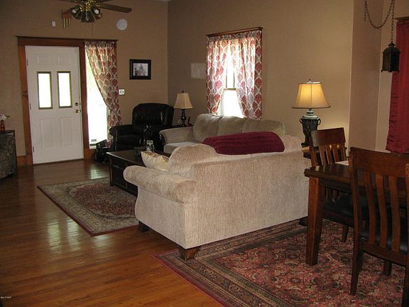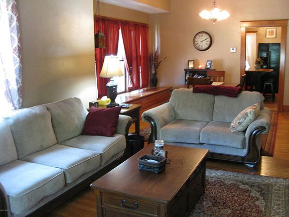 Charm galore in this roomy 4 or 5 bedroom/2 bath home with covered front porch, tall ceilings, wood floors and beautiful fireplace! Home offers a gorgeous updated kitchen including Wilsonart laminate counters, center island and all appliances; large master suite with walk in closet, built in dresser and barrel ceiling in bath. Beautiful chandelier in dining room, lots of storage and fresh paint throughout. Mudroom has pantry, trash compactor and access to basement with utility sink, toilet and new washer and dryer included as well as access to room on second floor that could be bedroom 5, office, or playroom. Oversized detached two car garage and plenty off street parking all on a corner lot.
