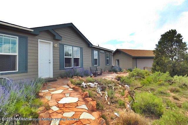 ACREAGE LIVING AT ITS BEST! Situated on 40 acres it offers a stock pond that is home to wildlife and occasionally elk. The owner has also set up a small gun range. A landscaped front yard includes numerous plants and flowers with an attractive native flagstone path leading to the entrance of the home. It is surrounded with an attractive wooden fence and the strategically built rear deck allows a spectacular view of the San Francisco Peaks and the surrounding mountains. Inside the home is an open floor plan with a sunken family room complete with a cozy fireplace. The large master bedroom, bath and closets offer privacy. The solar system and generator provide a strong source of power with automatic generator backup. Top this special property off with a 3 car garage.