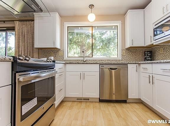 Wonderful location in one of Stayton's most desirable neighborhoods. Nice 1-level ranch home with all new carpet and freshly painted inside & out! Brand new kitchen w/granite counters & SS appl - opens to family rm w/cozy fireplace plus formal dining. Laminate wood flooring & triple-paned alum windows. Bonus rm could be 4th BR or office! Beautiful landscaping w/big deck & pond-feature. Oversized garage is xtra-deep w/shop area. Fenced yard & UG sprinklers. Newer high-efficiency gas heat & CAC.