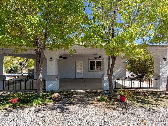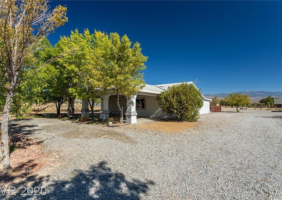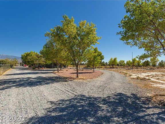 Paradise in Pahrump! Private 2.3+ acres in a quiet neighborhood (no thru access) on the north end of the valley with beautiful mountain views. Newly remodeled with contemporary details to include quartz countertops, new microwave, easy to access pull-out drawers & lazy-susan corner cabinet and a delightful kitchen island under a skylight. Detach 2-car garage with workshop area, insulated with above storage & pull-down stairs, 220amp service, swamp cooler. RV Parking with electric & water. Several out buildings for storage, livestock and/or horses. Above ground salt-water pool with secured deck. Fenced raised garden beds. New paint inside and out. Mature trees line horseshoe drive with dual road access. Fruit trees. Fully fenced property with 2 locking gates at road. Septic recently pumped. Solar hot water tank owned free and clear.
