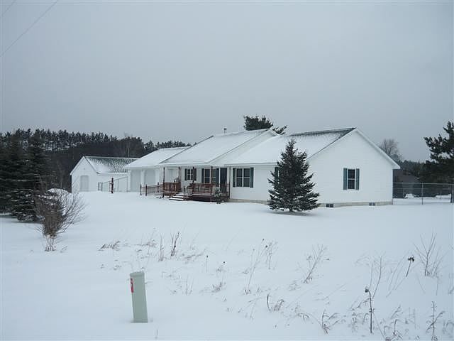 Horse Country. Newer ranch style home on 10 acres just minutes from Cadillac's north end. Miles and miles of nearby trails for the horseback rider (snowmobiles). Everything on one level, including large breezeway/mud room with half bath, utility room and pantry room nearby. Great room floor plan beyond. Spacious living room with Heat-N-Glo fireplace and large windows for natural light and views. Light oak kitchen with ceramic tile flooring. Includes gas range, microwave, frig.,dishwasher and trash compactor. Ample, open dining area with French doors to covered front porch. Inviting sun room overlooks the fenced back yard and acreage. Sit down and relax with a cup of coffee, the paper and a pair of binoculars. Bedroom wing includes a 3/4 bath, nursery/office in addition to 3 bedrooms. Master suite has private bath with his and her sinks and large walk-in closet. Solid pine six panel doors and trim throughout. Full basement is insulated and ready for future developing/finishing. Insulated 30 X 40 pole building with heat and running water. Perfect additional space for work shop, projects, hobbies and storage. There is lean-to storage outside across the back end of building. Wiring is in place for the back up generator to supply the house in the event of an outage. The household heating system includes a wood fired furnace that backs up the propane forced air system. Soon we will be wishing for central air and this home has it. Very attractive, well thought out country estate. Designed for low maintenance and high enjoyment.