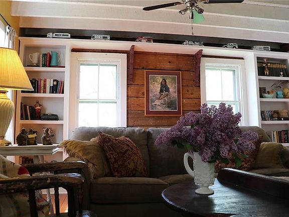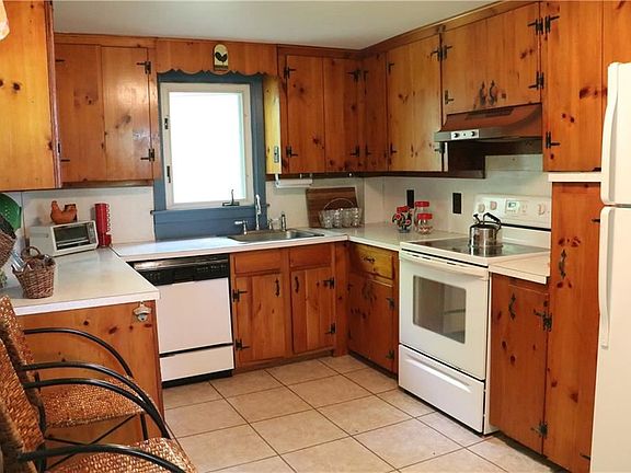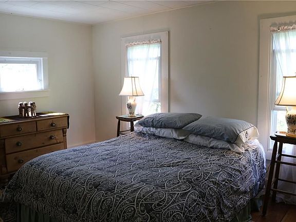 Picturesque country setting with tranquil vineyard views, ready for new owners to enjoy. The enduring charm of wide plank knotted pine floors complement the dining room and the spacious living room with built-in shelves and wood burning stove. Classic knotty pine cabinets provide plenty of counter and storage space, appliances are included. A half bath and enclosed back porch complete the first level. Upstairs are three bedrooms and a full updated bathroom with attractive pedestal sink and tile floor. The captivating charm of this house says home.