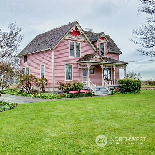 The iconic "Pink Lady" is on the market! This beautiful one-of-a-kind Victorian home with stained glass windows & widow's walk sets on 1.76 acres in tulip country with spectacular views of fields, sunrises & sunsets. The rooms are lovely & spacious w/outstanding woodwork. Inviting living rm, formal dining rm, updated kitchen with charming eating area. One bedrm down & 2 bedrms on upper level. Smallest bedrm w/sink in corner. Nearly new deck off back of house to take advantage of the peaceful surroundings, ever-changing views & abundant, gorgeous landscaping. Fruit trees & many flowering bushes abound. This is your change to own a piece of Skagit Valley history! .