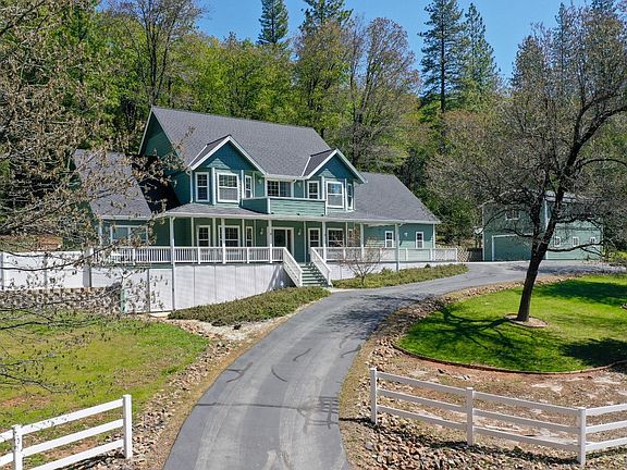 Quintessential farmhouse situated on 3+ acres in a beautiful forested setting. Energy efficient w/ three zone heating & air, two on demand water heaters in main home, one in guest home, & owned solar to keep the bills down. Granite counters, soaring ceilings, ceiling fans, & large windows offer a light and bright home. Main floor master, formal dining, large laundry room, fabulous office, loft, and 660+/- sq.ft. bonus room round out the home. Three car garage attached to main home with bathroom. Situated above a fabulous 720+/- sq.ft. second garage/shop and overlooking fruit trees is the 1/1 guest home w/ full kitchen, bathroom, large deck, & carport. Custom shed and Amish chicken coop! Ready for horse barn with power and water to site. Well maintained, with new exterior paint and seamless gutters. Allocated on sunny, level, usable land with lots of room to entertain & just minutes to Nevada City!!