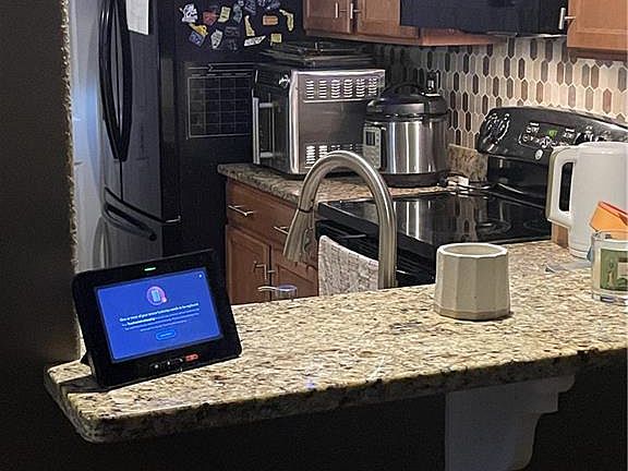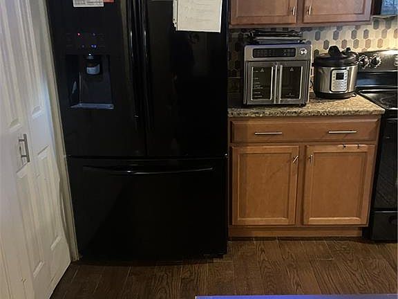 Electric fireplace media consoleFully fenced backyardFunctional two-level layoutGranite countertopsOpen back patioKitchen with wooden cabinetsWood flooring
