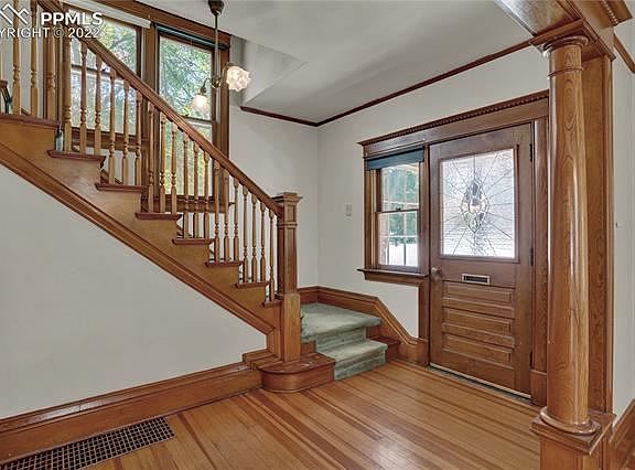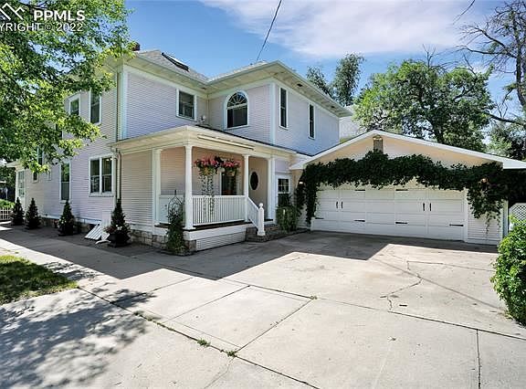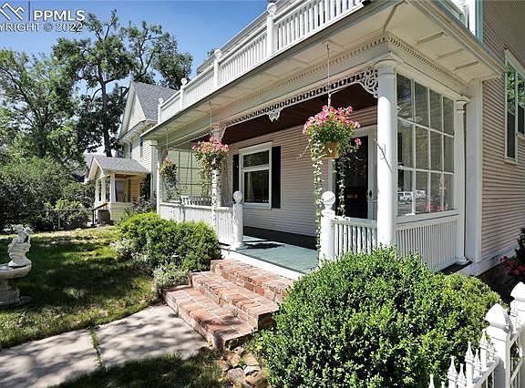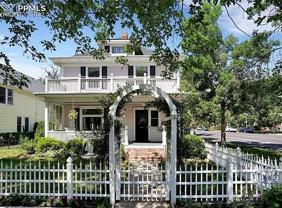 White picket fences and ornate wood archways, this Old North End home is FULL of character and charm! Located within walking distance of Downtown Colorado Springs, it's a true gem with decorative leaded windows, elaborate woodwork, Van Briggle tiles surrounding the original fireplace, preserved butler's pantry, picture rails with original hooks, and even a coal room in the basement. For 41 years, the owners have loved and cared for this majestic home, honoring its charm, not painting the woodwork or trim and even having expensive custom pieces made to match the original design. Hardwood floors cover most of the main level, with versatile rooms including spaces for a home office, formal dining room, and multiple living areas. A thoughtful addition transformed a former exterior patio into a hot tub room with brick flooring, now used as a living room with a fireplace and a french door walk-out to large garden patio. It also attaches the extra large 2 car garage, complete with built-in shelves and deep enough for nearly any car. The old fireplace in the kitchen is now useful space as a pantry, and double ovens in the kitchen + an additional oven in the butler's pantry equip you for entertaining guest! Room to relax with 3 outdoor areas including a large covered from porch, brick patio off the family room, and west-facing back porch off the driveway. Upstairs, an addition created a large master bedroom with sitting area, double wide walk-in closet with organizers, attached bathroom with double vanity and stackable washer/dryer, and touches of artistic decor and historic charm. Two additional bedrooms upstairs still boast of the original hardwood floors and original pulley windows, plus there's a full bathroom with a clawfoot tub. From this upper level, a staircase leads to a finished attic space, perfect for a playroom or arts and crafts. The basement includes washer/dryer, wash sink, additional toilet, and tons of storage. Come see it today!