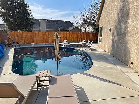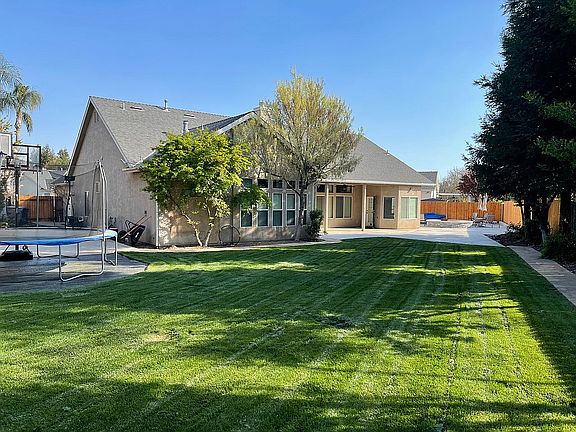 Fabulous single-level home on a large semi cul-de-sac lot. This functional floor plan features 5 bedrooms and 3 bathrooms with elegant formal dining room and spacious living room with fireplace. Office/den has built-in wall bookcase. Kitchen with granite counters, center bland, gas stove, stainless steel appliances. Hard wood and tile flooring throughout the house. Master bedroom has huge walk-in closet with its own fireplace. Stunning custom master bath has a luxurious shower for two, with dedicated shower heads and rain heads, and a jetted spa. Spacious yard featuring a gorgeous pool and hot tub, lighted basketball court, tool shed, and an amazing patio.There is also a neighborhood playground/ park in a walk in distance. Award winning Clovis Unified School District- Woods, Alta Sierra, Buchanan.