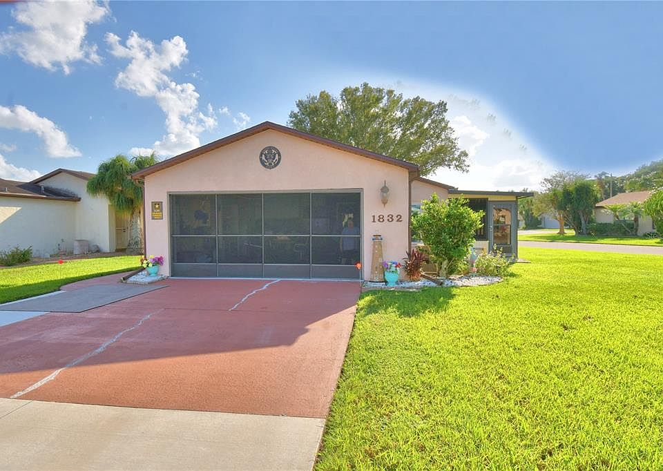 Welcome to this beautifully updated 2-bedroom, 2-bathroom home in the adored 55+ community of Spanish Haven in sunny Winter Haven, FL. This charming residence features a two-car garage and an inviting open floor plan with beautifully refinished exposed beams that bring character to the living areas. The modern kitchen is a chef’s dream, boasting granite countertops, stainless steel appliances, and an abundance of natural light. The dining area offers a lovely space perfect for entertaining. The spacious primary bedroom includes an en suite bathroom and a generous walk-in closet, while the guest bedroom offers comfort and privacy with its own dedicated bathroom. Enjoy your morning coffee or unwind in the evening in the cozy Florida room, or step outside to the covered patio for a relaxing outdoor retreat. Spanish Haven provides a range of amenities, including shuffleboard, a heated salt water community pool, and a clubhouse with a kitchen, great room, and convenient facilities. The location is ideal, just moments from restaurants, medical offices, shopping, and popular attractions like Legoland, with easy access to the interstate, international airports, Disney parks, and more. Roof was replaced 2017, roof over Florida room 2022, new hurricane impact windows and sliding doors 2023, updated electric panel 2022, new GFI's 2023, extra insulation 2022, new blinds throughout 2023, new a/c 2020, new carpet in bedrooms 2023, new washer and dryer 2022 and much more. Don’t wait—call today to schedule your private showing!