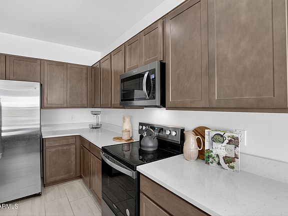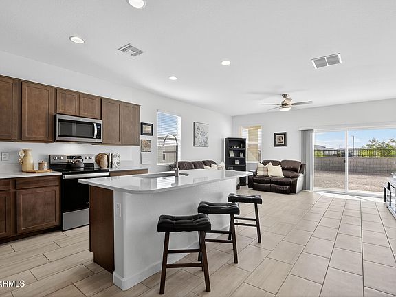 3 Car garage! Fantastic price and like new! This beautiful 3-bed, 2-bath single-story home in Desert Moon Estates, has all the right details including premium lot with view fence. Backing to open space with no rear neighbors, this move-in-ready home features 12x24 tile in main areas, quartz countertops, burlap shaker cabinets, stainless appliances. The split layout offers a spacious primary suite with dual vanities and walk-in closet. Includes blinds, verticals, and energy-efficient features. Located on a quiet street near parks and schools and quick access to shopping.