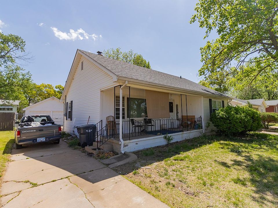 THIS PROPERTY IS BEING OFFERED IN A MULTI-PROPERTY AUCTION VIA LIVE STREAM WITH REAL TIME BIDDING, AUCTION BEGINS AT 5:30 PM ON MAY 9th, 2024. ONLINE BIDDING IS AVAILABLE THROUGH SELLER AGENT’S WEBSITE. PROPERTY IS SELLING WITH CLEAR TITLE AT CLOSING AND NO BACK TAXES. PROPERTY PREVIEWS AVAILABLE. NO MINIMUM, NO RESERVE!!! 2-bedroom, 1-bathroom home located in southeast Wichita. The exterior features vinyl siding, a covered front porch, and a detached 2-car garage! This home is rented for $850 per month until 8/31/2024 to a long-term tenant of 7+ years. Inside is a spacious living room with hardwood flooring, a decorative fireplace, and a picture window. Next is the dining room with built-in cabinetry, hardwood flooring, and French doors that lead to the large family room. The kitchen offers ample wood cabinetry, an eating bar, and the refrigerator, stove, and dishwasher transfer. Off the kitchen is the separate laundry room with access to the backyard. Down the hallway are both bedrooms with hardwood flooring and a full bathroom with a tub/shower combination. Don't miss out on this adorable home selling to the highest bidder, regardless of price! Per seller, HVAC was replaced in 2019. *Buyer should verify school assignments as they are subject to change. The real estate is offered at public auction in its present, “as is where is” condition and is accepted by the buyer without any expressed or implied warranties or representations from the seller or seller’s agents. Full auction terms and conditions provided in the Property Information Packet. Total purchase price will include a 10% buyer’s premium ($1,500.00 minimum) added to the final bid. Property available to preview by appointment. Earnest money is due from the high bidder at the auction in the form of cash, check, or immediately available, certified funds in the amount $7,500