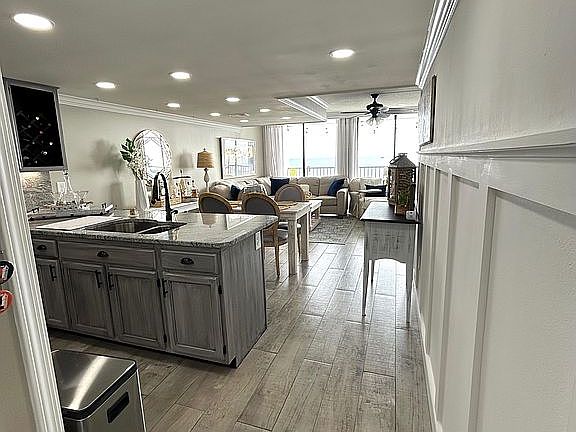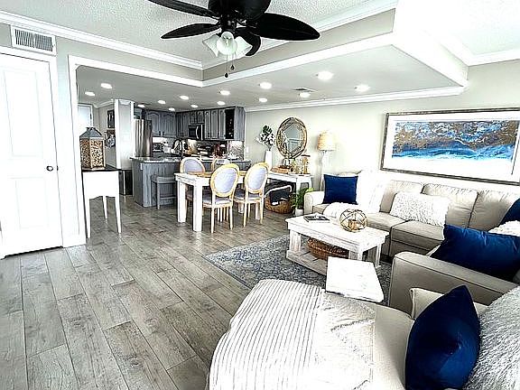 We are excited to offer our spacious Gulf front 2 bedroom /2 full bath Unit 710-A at Gulf Shores Surf & Racquet. This unit is one of only 6 deluxe sized units within this well maintained complex. This unit was remodeled in late 2019 to include: ceramic plank flooring throughout to include balcony, large crown molding throughout the entire unit, kitchen/bath granite counter tops and back splash, with under cabinet lighting, all new stainless appliances & refrigerator, board & batten entry way and hallway, master walk-in tiled shower, tiled tub/shower, full size washer/dryer, ceiling fans, LED lighting, 4 wall mounted Roku Smart TVs (Living room -75", Bedrooms - 55", balcony - 55"), all new interior plumbing & fixtures, full size water heater, expanded shelving, and keyless entry. HVAC (exterior & interior coastal units) with Wi-Fi programable thermostat replaced in late 2022.