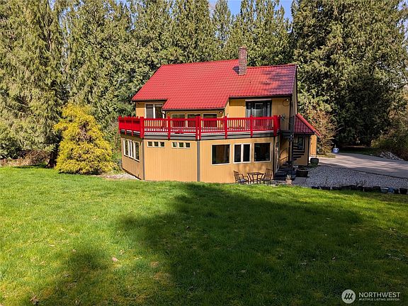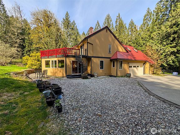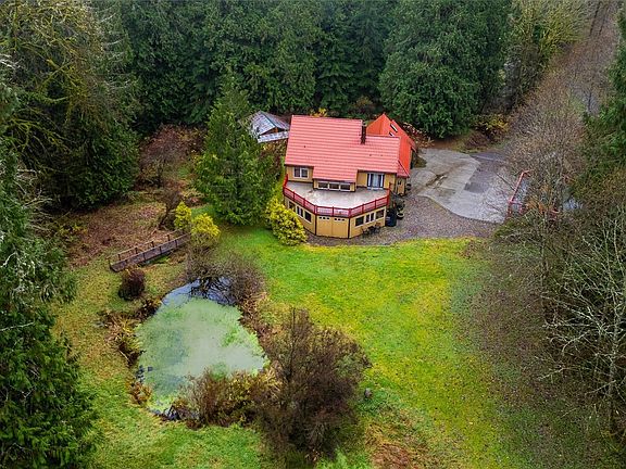 Behold! Your SANCTUARY! Beautiful trees, a bridge leading to a pond that feeds into the Stillaguamish River, deer prancing in the background. Plenty of water for gardens galore on this 5+ acre property with a one-of-a-kind storybook home. Enter into soaring vaulted ceilings w/ a spacious floor plan which creates an airy feel. The impressive living room opens into an enclosed cedar porch with the large windows making nature the focal point. Primary bedroom occupies the upper left wing & leads to a private deck. Additional building with power could be turned into an ADU. Lower level of the property has water spigot & is ready for an additional shop/garage. Access to river & just minutes from DT Arlington!