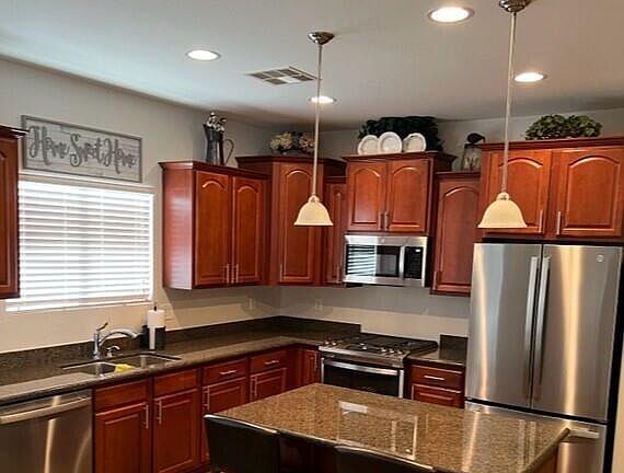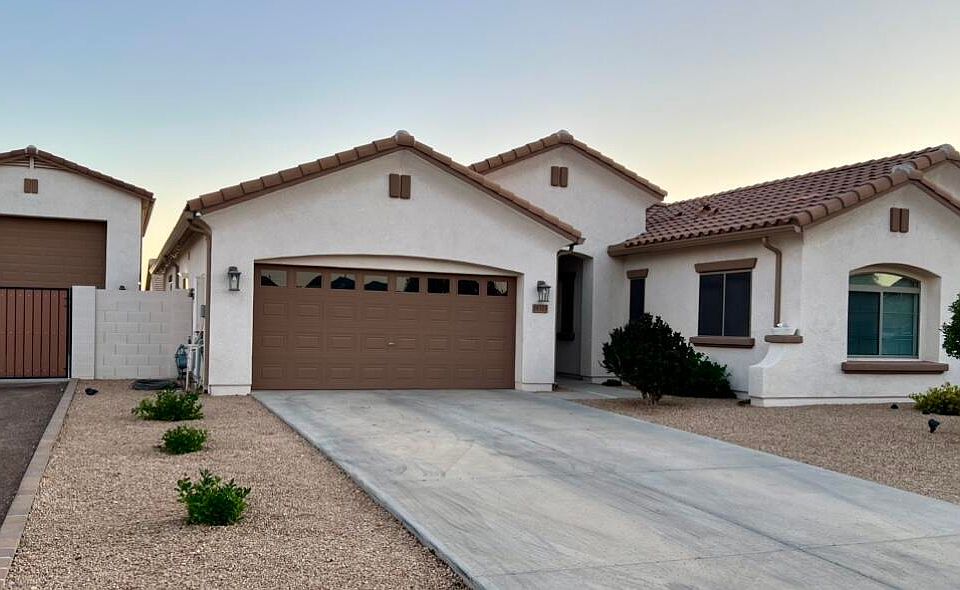 A beautiful, spacious, and cared-for home on a large North facing lot with an 840 sq. ft. (20' x 42') detached RV garage. This property offers stunning views of the White Tank Mountains and a substantial amount of room for relaxing, entertaining, and tinkering! This home, located in the desirable neighborhood of Savannah near freeways and tons of shopping, offers 4 bedrooms and 2.5 bathrooms, an eat-in kitchen and formal dining area, and a separate den or office – perfect for the work-from-home professional! The kitchen was recently upgraded with new SS GE appliances, including a gas stove with a griddle and a convection oven with a built-in air fryer! The owner's suite is large, with its own access to the backyard patio. The ensuite offers dual sinks, a separate shower, and a tub. The shade and fruit trees are established and thriving! The home is surrounded by only single-story homes behind and beside it, and the backyard has plenty of room AND potential for whatever entertaining elements you desire! Other recent upgrades and additions include rain gutters, a Steel Shield Security Door, a 50-amp receptacle located near the front of the home, a motion sensor light, a new AC unit, an RV driveway with permanent borders, and new gates. No expense was spared when the detached garage was built! Equipped with its own 4-ton HVAC system, installed in 2021, the garage was upgraded with its own 50-amp receptacle, epoxy flooring, fresh paint, two motion sensor lights, plumbing, and a 14-ft. insulated garage door. The concrete pad in front of the RV garage adds at least two additional parking spaces but can also be used as a courtyard for more entertaining!