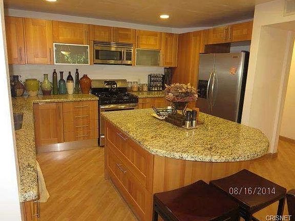 Regent Court is conveniently located within walking distance to Ventura Blvd shops and restaurants and easy access to 101 Fwy. This spacious and open floor plan one level condo is one of the larger units in the complex and it is located in the front building. A Large living room with fireplace and a spacious dining area connects to a beautiful upgraded kitchen with a large center island and granite counter tops, modern looking cabinets, stainless steel appliances including a newer refrigerator and a wine cooler. Laundry hookups inside of the unit. Complex offer several guest parking spaces and a beautiful pool and spa.