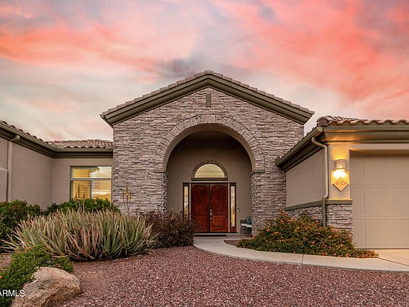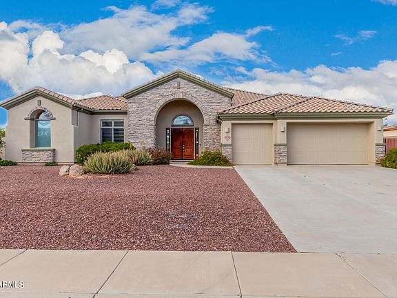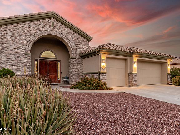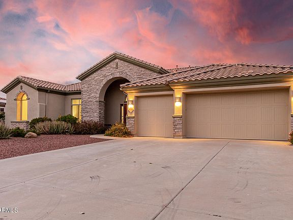Gorgeous residence featuring a spacious 3-car garage & RV gate in the Savannah Community has everything you've been looking for! Enjoy mesmerizing views of the majestic White Tank mountains from your private 1/2 acre lot. Discover an impressive split floor plan offering 12 ft high ceilings, soothing palette, soft carpet in all the right places, dazzling light fixtures, 20x20 tile flooring, a delightful modern fireplace, & multi-sliders leading to the back patio. The stunning chef's kitchen is a cook's delight showcasing 42'' chocolate-stained cabinets, granite counters/backsplash, SS appliances & a large island complete with a breakfast bar. Oversized main suite boasts plenty of natural light, back patio access, a walk-in closet, & a private bathroom with dual sinks, garden tub, & walk-in shower. You'll also find a Jack & Jill bathroom! The spectacular backyard is an ENTERTAINER'S DREAM. Covered patio, stone-accented firepit, a sparkling pebble tech pool w/spa, & raised garden beds with irrigation complete the picture of this Oasis! CE Monogram appliances, Moen fixtures, & close to A+ Schools. This gem won't disappoint!