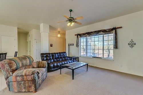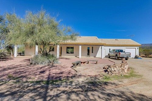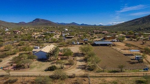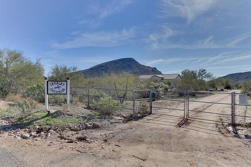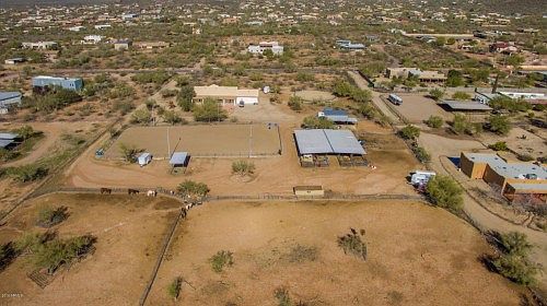 Custom home on almost 5 acres ready for horses. 90'' x 185'' lighted arena, 40''round pen, 100'' x 150'' small turn out and 100'' x 200'' big turn out. 10 mare motel stalls 12'' x 24'' (6 fully covered, 4 half covered and 2 12x12 shaded areas that can be stalls or turn outs and room for additional stalls. Two separate hay storage barns that can hold up to 200 bales of hay and tack room. Enjoy being surrounded by gorgeous mountain viewsm trails off of the property for biking and riding. A small town feel, just minutes from Metro Phoenix. Home features 3 bedrooms plus a den. Master showcases separate entrance to backyard. Living space is perfect for entertaining with eat-in kitchen and with an open concept great room.