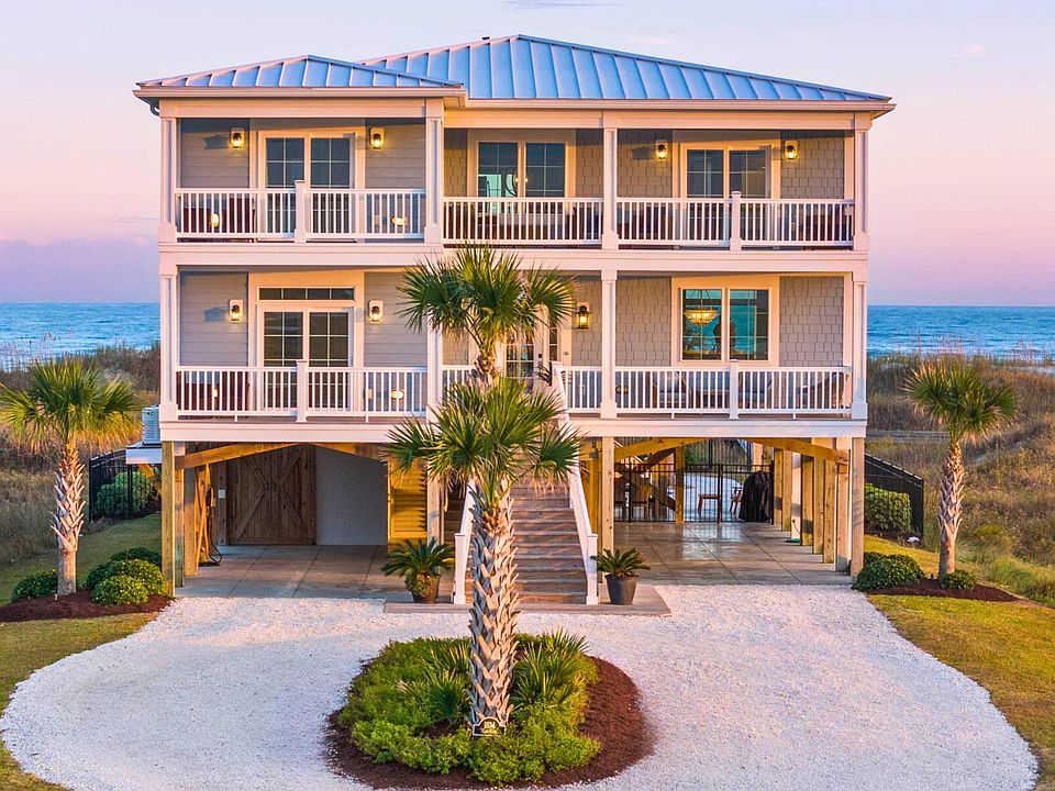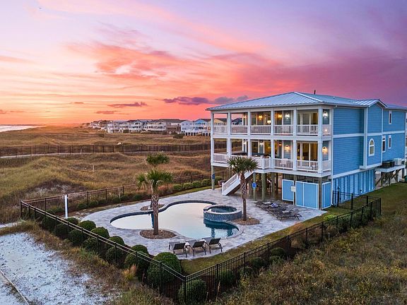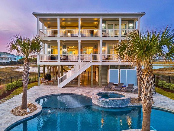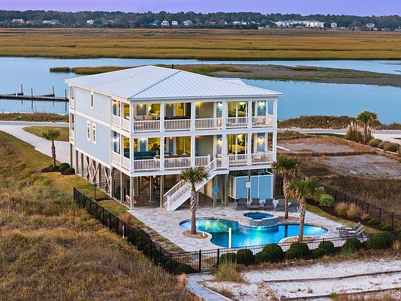 Welcome to Sandown South, an unparalleled oceanfront retreat in the exclusive gated community of Palm Cove on the tip of Sunset Beach Island. This exceptional property offers a rare opportunity to own a home that spans from the ocean to Jinks Creek and offers direct access to the Intracoastal Waterway. Enjoy breathtaking views of the Atlantic Ocean and the ICW from every room, making this residence truly one of a kind. Designed with elegance & functionality in mind, this 6 bedroom, 8 bath home offers luxurious accommodations, including ensuite bathrooms for each bedroom & an elevator serving all levels. Each bedroom, except one, features porch access. The gourmet kitchen is a chef's dream, complete with 2 full-sized refrigerators, 2 dishwashers, ice maker, & 36'', 6 burner Thor gas stove to make meal preparation easy. The kitchen island is outfitted with a prep sink and undercounter microwave. The open-concept living room includes a wet bar & beverage refrigerator & flows seamlessly onto a spacious covered deck overlooking the gorgeous travertine stone deck, private pool with large sun shelf and spillover spa, providing the ultimate space for relaxation or entertaining. Upstairs, the media room offers a cozy spot for movie nights & opens to a covered deck and panoramic views. Hardwood floors & tasteful decor throughout the home create an inviting yet refined atmosphere. Outside, you'll have access to the community beach walk, dune walkover and Palm Cove Community Marina which has 9 slips with electric hookups. Sunset Beach is ranked #4 on National Geographic 21 Best Beaches in the World, offering pristine sandy shores, the famous Kindred Spirit Mailbox, & many top golf courses just minutes away. Sandown South offers excellent income potential, sleeping 19. Whether you're looking for a lucrative investment property or a personal sanctuary, this is an extraordinary opportunity to own a piece of paradise.