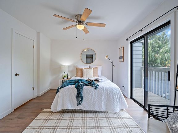 A charming townhome in a desirable Southeast Boise location, offered at an excellent value! Centrally located in the heart of SE Boise, this low-maintenance townhome sits just walking distance from dining and shopping in Bown Crossing, with easy access to the Boise River Greenbelt and foothill trails right out the front door! The open living quarters showcase chic updates including modern light fixtures and new LVP flooring throughout, punctuated by a cozy wood burning fireplace and beautiful natural light. The upper-level features two bedrooms each with a private balcony. Master suite offers direct bathroom access and dual closets. The low-maintenance grounds provide space for open air dining with little to no upkeep. Enjoy the convenient lock and leave lifestyle with a community pool, direct access to walking paths, and amazing proximity to downtown, BSU, and Lucky Peak!