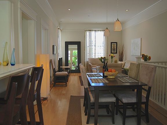 This furnished two-level condominium in the heart of North Beach is located on a quiet off-street lot. The condominium opens to a lovely sunny garden with olive trees, a grilling area and large stone dining table.