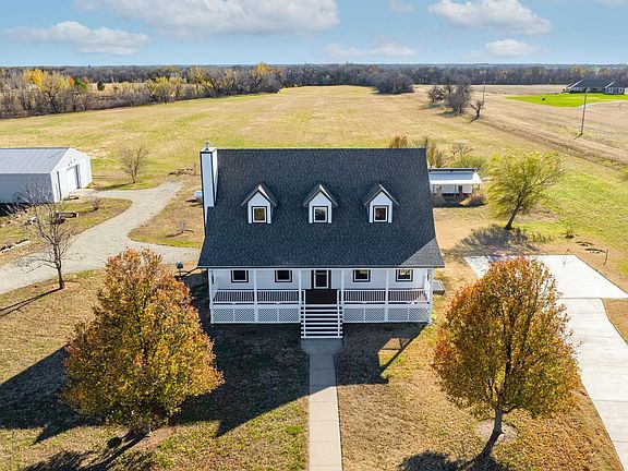 Nestled on a serene almost 10-acre parcel, this picturesque one-and-a-half-story home is a true countryside gem. With over 4,000 square feet of living space, 4 bedrooms, 3.5 baths, and a full finished basement, it offers the perfect blend of space and style for comfortable living. Exterior: As you approach the property, you'll be captivated by the tranquility of this vast almost 10-acre setting. The home is complemented by a huge 85X45 outbuilding with a cement floor, a commercial grade overhead door professionally installed over 12 ft high, perfect for RV's, boats, workshop etc..., a fully functional chicken coop, a 3,600 ft. vegetable garden with highly improved soil, a productive fruit orchard, and covered front and back porches that provide the ideal vantage points to enjoy every sunrise and sunset. Interior: Inside, you'll discover a thoughtfully designed open concept living space on the main level. The rich hardwood floors and a cozy fireplace create an inviting atmosphere, perfect for gatherings and relaxation. Kitchen: The kitchen has been beautifully updated with new quartz countertops, stylish tile backsplash, new sink, faucet, disposal, and light fixtures. It's a culinary dream, ideal for meal preparation and entertaining. Bedrooms and Bathrooms: This home offers 4 spacious bedrooms, each with its unique charm. The primary suite features an ensuite bath for added convenience. In total, there are 3.5 tastefully appointed bathrooms that make daily routines a breeze. Basement: The full finished basement is a versatile space, ready to serve as your entertainment hub, home office, or gym – the possibilities are endless. For your protection, there is a storm shelter/safe room in the basement with concrete walls and a certified safe room door with 2 fully functional Murphy beds. Updates and Features: This home boasts a series of recent updates, including newly painted exteriors and interiors, new carpet throughout, and brand-new lighting fixtures. In addition, a new kitchen countertop and backsplash have been added, making the heart of this home shine. Location: Situated just a 20-minute drive from downtown Wichita, you'll have the best of both worlds – the peace and space of the countryside with quick access to city amenities. The paved frontage provides easy access to Hwy K-42, making commuting a breeze. Year Built: This home was built in 2002, which means it's relatively new and well-maintained. Don't miss this rare opportunity to own a piece of countryside paradise with all the modern comforts and amenities you desire. Schedule a showing today and experience the unique charm and potential of this property. Please contact the listing agent for more information.