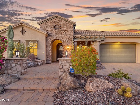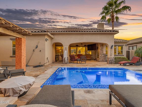 This exceptional luxury home, located in Estrella's exclusive Serenity neighborhood, offers unmatched amenities and one of the most breathtaking view lots you'll find anywhere! With prepaid solar and energy-efficient upgrades, this home truly stands out. The hillside backyard is a resort-style masterpiece, featuring an infinity-edge pool with spa, a custom pergola with outdoor kitchen and dining bar, multiple travertine-covered patio areas, and an elevated sitting space showcasing panoramic views of the Sonoran Desert Preserve and the majestic Estrella Mountains. Step inside to discover thoughtful design and luxurious comfort throughout. The owners spared no expense, adding countless upgrades for lasting enjoyment. The front exterior welcomes with a paver driveway, artistic inlaid walkway, lighted posts, raised planters, and a charming front porch. Inside, the elegant layout features a formal dining room, spacious great room, private study, and bedrooms connected by a Jack and Jill bath. The chef's kitchen impresses with distinctive cabinetry, granite counters, a large island, gas cooktop, butler's pantry with wet sink, and dual RO drinking systems.
