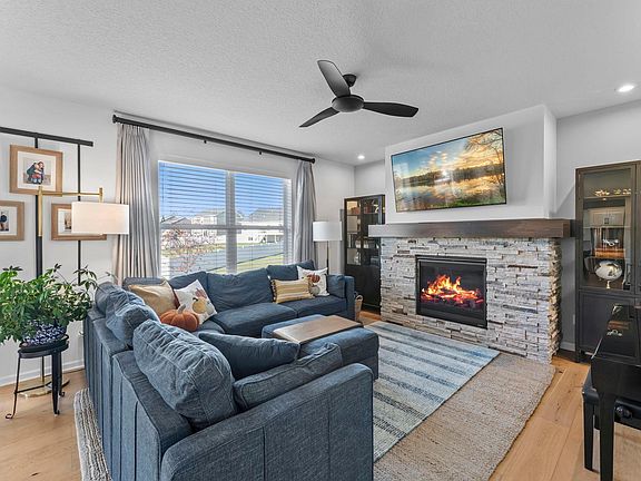 Beautiful 4-bed, 4-bath home in a prime Lakeville location! Peaceful neighborhood near parks and Highview Elementary in the top-rated Lakeville district. Bright, open layout with 9-ft ceilings, engineered hard wood, and large windows. Main level features spacious living room with Heat & Glo stone-surround fireplace, stylish dining area with backyard access, and a sleek kitchen with GE stainless appliances, tile backsplash, island with seating, and closet pantry. Dedicated main-floor office with custom built-ins and window seat. Convenient mudroom with storage and half bath. Upstairs offers airy loft, vaulted primary suite with walk-in closet and ensuite bath, two additional bedrooms, additional full bath, and upper level laundry with GE washer/dryer. Newly finished lower level includes large family room, 4th bedroom, and ¾ bath with heated floors. Gorgeous curb appeal, front porch, landscaped yard with invisible fence, sprinkler system, Nest thermostat, and attached 2-stall garage. Stylish, functional, and move-in ready!