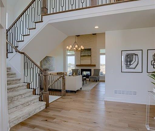 "The Kingston" is an Impressive 1.5 story home built by Rodrock Homes. This open design is perfect for entertaining and family gatherings. Lofty Beamed ceiling in Great Room with see-thru fireplace to the Covered Lanai.. Large study off the front hallway. Beautiful kitchen with functional island and walk in pantry. The primary bedroom on the first floor has an Spa like bathroom and oversized closet. EAST facing lot. There is still time for you to make some final selections including flooring, counters, and lighting. Blue Valley Schools are nearby! Community pool and amenities are scheduled to open Summer 2026.