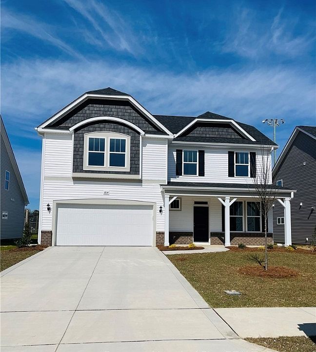 MOVE IN READY! The Topsail plan by H&H Homes. Wide open floor plan with coffered ceilings in the formal dining room, large kitchen with island opening to generous sized eat in nook. This area is open to the large family room with fireplace. Access the covered porch from the nook. Upstairs you will find a relaxing master suite with cathedral ceiling, generous closet space, dual vanities, garden tub and separate shower. Large laundry room, two bedrooms and a shared full bath.