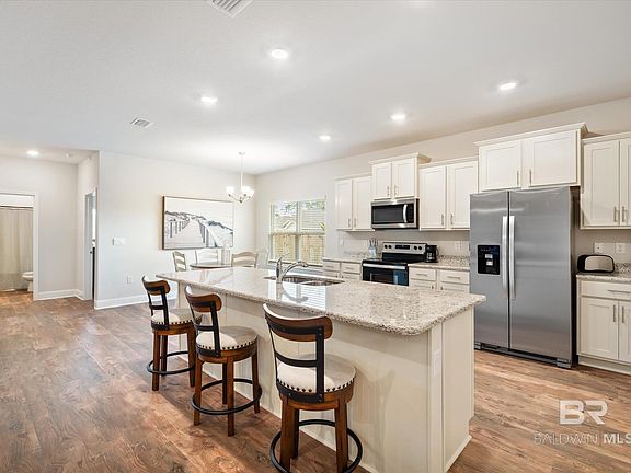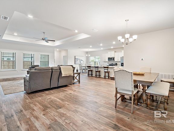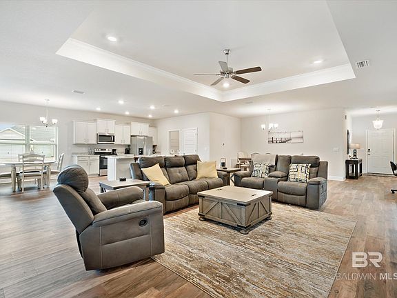 This beautiful CORNER lot home has barely been lived in. Built in 2022 this GOLD fortified home includes all furnishings and all appliances. Centrally located in Foley this home is only minutes to shopping, dining, medical facilities, entertainment, and just a short drive to the gorgeous beaches of Gulf Shores and Orange Beach. This 4 bedroom, 3 full bath, DESTIN plan includes 9 ft. ceilings with 10 ft. trey ceilings in the living room and primary bedroom. The Ensuite has a garden tub and separate beautifully tiled shower. The kitchen and baths have granite and white cabinets. The kitchen island bar overlooks a huge living area and dining room. The home features a 3-car garage and also includes a Home is Connected (SM) Smart Home Package and Hurricane fabric shields. A screened in back porch and fenced in back yard make this property turn key. House is currently being used as an Airbnb but would make a great primary residence or 2nd home. So many options!
