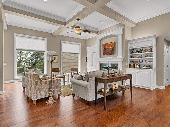 Welcome to your next chapter in this impeccably maintained, two-owner gem tucked in the serene southern tip of Remington Place—just a block from the Redbud Trail! With 5 bedrooms, 4 bathrooms, and a 3-car garage, this home is built for comfort, connection, and entertaining. Step inside to discover an open-concept main floor featuring a bright bay-windowed breakfast nook, formal dining room with a view, and a cozy living room anchored by a gas fireplace. The kitchen is a true standout—complete with a gas range, walk-in pantry, island with bar seating, and enough counter space to host Thanksgiving dinner and prep your morning smoothie. A granite-topped divider is the perfect place for a party buffet or coffee station. Hickory hardwood floors add warmth and charm to the living, dining, and front office (which can easily serve as a 2nd main floor bedroom). The spacious primary suite offers peaceful views of the eastern tree line, a sunny bay window sitting area, large ensuite bath, and walk-in closet. Downstairs, the mid-level walkout leads to a generous view-out basement—think movie nights, game days, and weekend guests—with a fireplace, wet bar, built-ins, full-size fridge, and three bedrooms (two sharing a full bath, one with its own). You'll also love the oversized storage room, perfect for seasonal decor or Costco hauls. Out back, enjoy professionally landscaped gardens and a concrete path for easy backyard strolls. With a new roof (2018), fresh exterior paint (2023), and low-maintenance HOA perks like lawn care, snow removal, and sprinkler services, this home makes living easy.