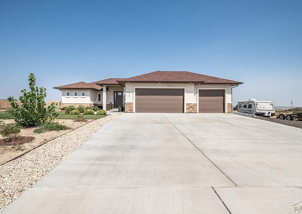 Beautiful Pueblo West Northside Ranch-style home with 3 bedrooms, 2 baths, and a 3 car garage. Easy commute to Colorado Springs! Everything is on one level with a hip roof design, stack-stone, and covered entry. Vaulted ceilings, open floor plan, stack stone fireplace, granite countertops, plus tons of cabinet space. Both showers have tile surrounds, tile floors, and granite tops as well. The spacious primary bedroom has a very large walk-in closet with custom shelving. Enjoy the outdoors from the large covered rear patio. Landscaping in the front, which consists of turf grass and rock. There is also a grass area in the backyard! 3 car attached garage is also heated and cooled with a mini split.. Better than new!