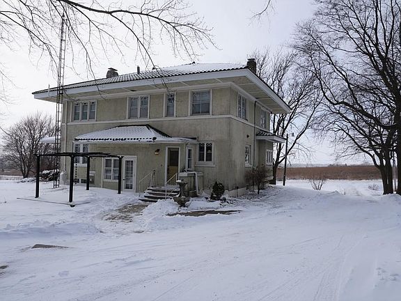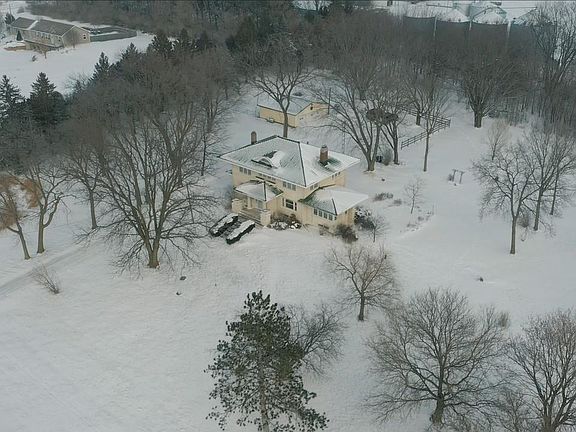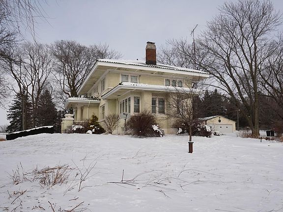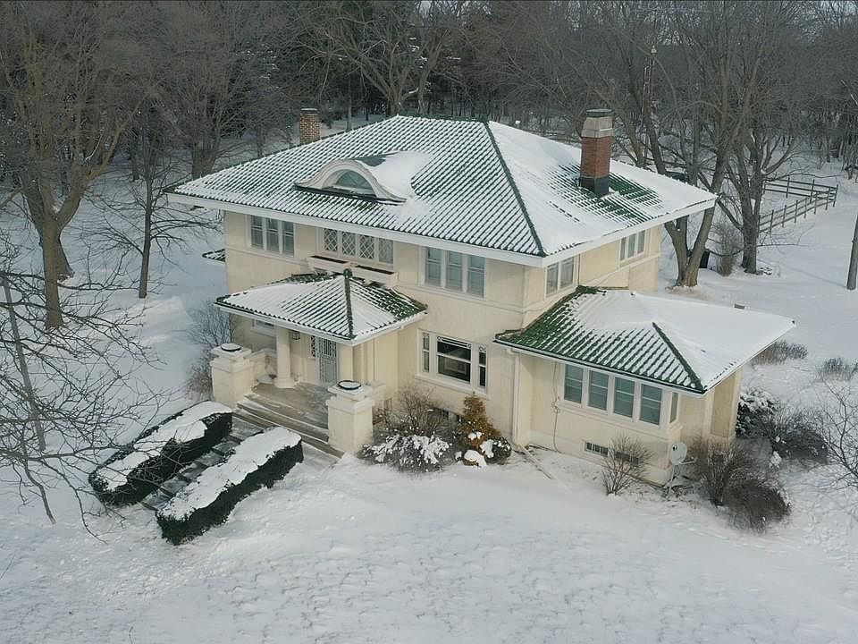 Stately prairie style home situated on 3.76 acres! Located about a mile from town on a hard surface road. This grand home, designed by architect Howard Burr and built for the Blunt family, features midcentury craftsmanship tastefully updated for modern living. Heavy stucco construction and new tile roof. The interior is full of beautiful millworks, built-ins and hardwood floors along with many period fixtures and finishes. A grand foyer opens into the home’s main level. The living room has a handsome wood burning fireplace and flows into a south facing sunroom with another wood burning fireplace. Next to the living room is a cozy library/office with half bath. The formal dining room features a decorative ceiling and storage built-ins. The eat-in kitchen includes stainless steel appliances and large pantry. A lower-level family room with laundry closet is tucked to the back of the house. Upstairs offers 4 bedrooms and 3 baths. The primary suite has a private bath with jetted tub. Down the hall are 3 more bedrooms plus a full hall bath and a ¾ Jack-and-Jill bath. The full basement has ample space for storage and utilities. Out the back door is a concrete patio with gazebo and the detached 3-car garage (30 ft x 30 ft). The expansive yard is lightly wooded and landscaped with a variety of perennial plantings. This property is a rare find you won’t want to miss!
