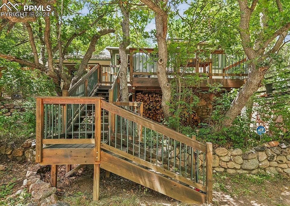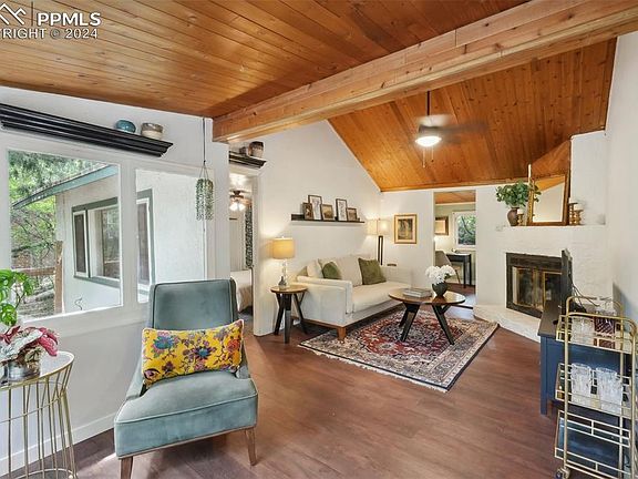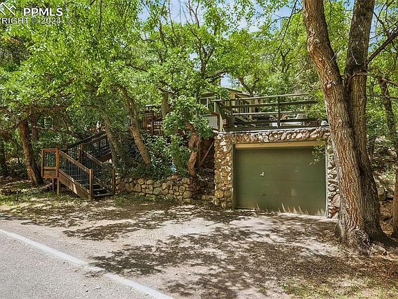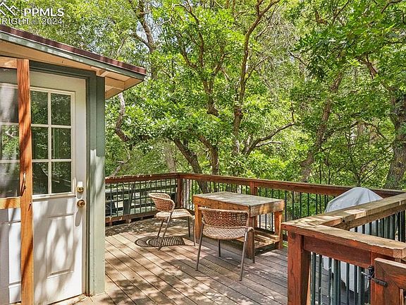 Charming 2 bed, 2 bath bungalow nestled in the trees in Cheyenne Cañon. Listen to the tranquility of Cheyenne Creek from the private decks where neighbors seem miles away. This beautiful historic home is conveniently located minutes from public trails, the esteemed Broadmoor Hotel, Seven Falls, and District 12 Cheyenne Mountain schools. Walk into the bright, sunlit living area with stone wood-burning fireplace, dining nook and full kitchen with granite countertops and gas range, all with new flooring. The primary bedroom includes an ensuite half bathroom and walk-in closet. An exquisitely renovated full bathroom, bright second bedroom, and efficient office nook round out the space. Outside enjoy two separate decks overlooking Cheyenne Creek with mountain views through the trees. The spacious detached one car garage is built with enchanting stone walls and provides ample room for your car and storage. The wooded lot has access from both West Cheyenne Road and Cheyenne Boulevard where extra on-street parking is available.