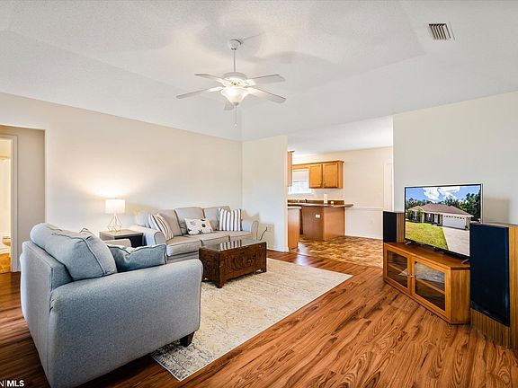 Welcome to Blackwater Lakes! This charming brick home gives you exactly what you need with a split floor plan, partially open concept, fenced yard and more. Enter your home to your living room with new LVP flooring. Then mosey into the breakfast dining area that is open to the kitchen with it's breakfast bar. Plenty of cabinets for storage and a pantry in the laundry room. Primary bedroom features walk-in closet and en suite with new large shower and private toilet room. Additional bedrooms are on the other side of the home for privacy and comfort. Back yard includes a large deck great for entertaining, fully fenced yard with a picturesque tree lined view. Roof is Bronze fortified! Blackwater Lakes has NO HOA DUES and is a quick hop to Bucee's for easy access to I-10 and the Beach Express. Call your favorite Realtor today to schedule a showing after March 24th.