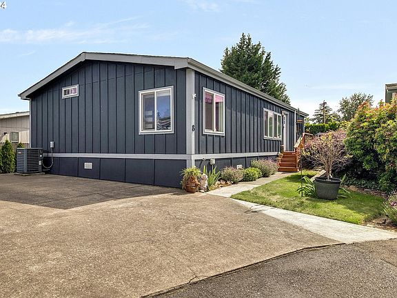 Like new fully updated double wide manufactured home located in a 55+ community. This 3 bed, 2 bath, 1,188sqft home offers an open concept layout perfect for entertaining, large kitchen w/island, stainless steel appliances, spacious guest bedrooms, full guest bath with new vanities, large primary bedroom with walk in closet, full spa shower and side door entry from bathroom into laundry. Outside you have plenty of parking space, private back yard with storage sheds, and views of Mt. Helens on a sunny side! Space rent is $925/month.