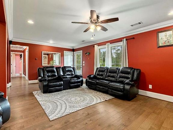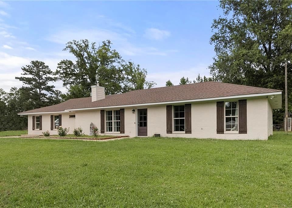 Beautiful, single-story brick ranch on over 5 acres in Mathews, AL! Located conveniently off of Troy Highway, this updated and gated property offers the dream of country living. Upon entering the home, you will immediately notice the open floor plan and extensive updates. The living room is a great size and features durable engineered wood floors, fireplace, built-ins. An arched entryway takes you to the wet bar conveniently located off of the living room, kitchen and dining area. The kitchen is updated with white cabinets, tile backsplash, updated appliances, and features counter seating. There is an oversized breakfast/dining area open to the kitchen. The primary bedroom is expansive with plenty of space for a seating area. The en-suite bathroom is also a great size with two sinks, floor to ceiling tile shower, and large soaking tub. The other three bedrooms are all a great size and feature carpet flooring. They all share a full bathroom that is also conveniently located for guests.
