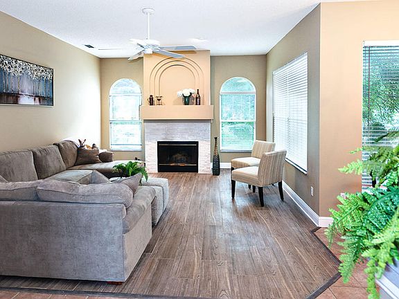 Stunning home on 1/3 Acre cul-de-sac lot in Gated Community Just Minutes to The Beach! Outstanding design with soaring 14 FT trey ceilings, showcase Quartz fireplace. Enjoy year round living in spacious heated & cooled Florida RM. Well designed kitchen in the center of the action, ideal for entertaining with walk-in pantry & Breakfast Nook. Luxurious Master Suite with sliding glass doors to Florida RM, walk-in closet, trey ceiling & inviting garden bath. No carpet here! All floors are tile or laminate. GORGEOUS NEW WOOD-LOOK TILE IN LIVING ROOM, FAMILY ROOM, BREAKFAST NOOK, DINING ROOM & MASTER BEDROOM. BRAND NEW ROOF! Upgraded TRANE Heat Pump = Low Energy Bills. Premium Amenities incl: Community pool, tennis,lakes, parks, walking trails, playground & So Much More!