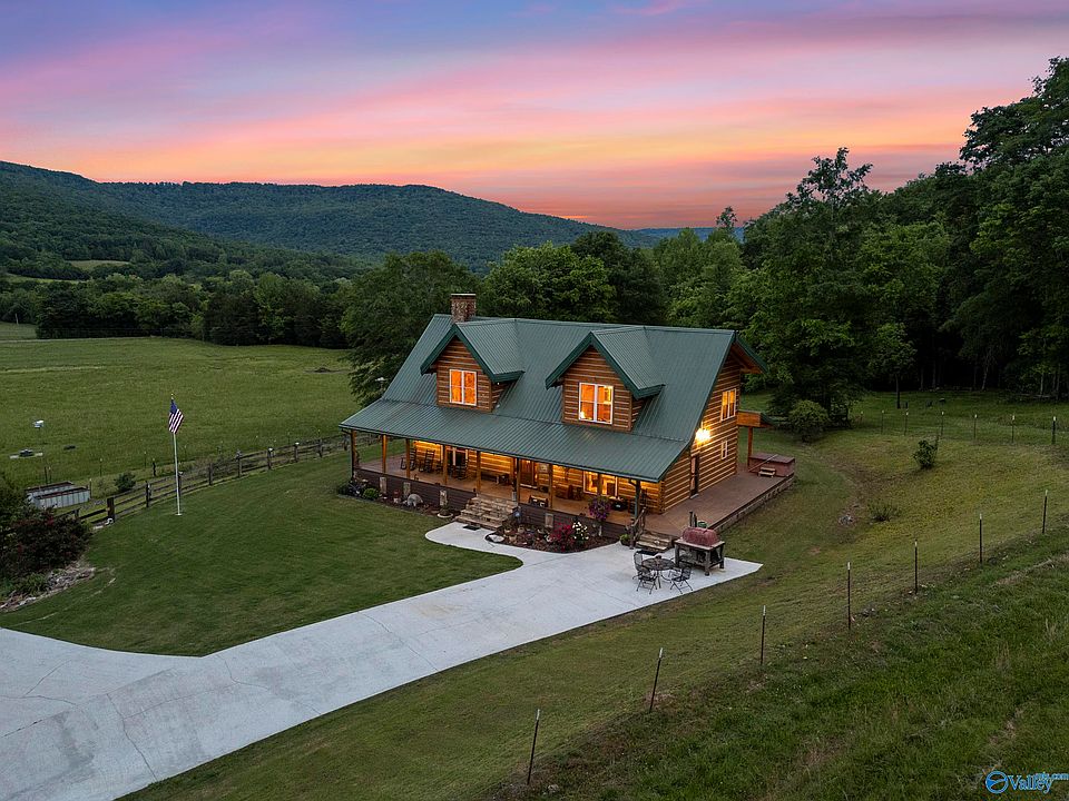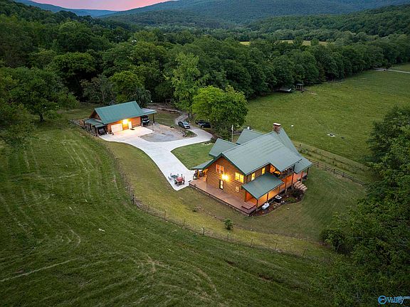Discover 62.75 breathtaking acres at 1835 County Road 9 in Estillfork, AL—stretching from a mountain top to the river below. This picturesque property offers pasture for livestock, abundant wildlife, and endless opportunities for hunting and fishing. The custom-built log cabin features kiln-dried White Pine logs from North Carolina, while the detached garage/workshop with loft is built from Poplar. The original 1980s cabin still stands, adding rustic charm. Just 45 minutes from downtown Huntsville, this private retreat offers natural beauty, stunning views, and unmatched tranquility.