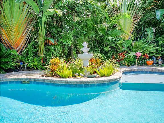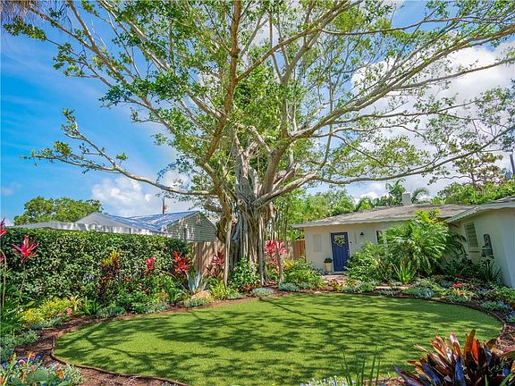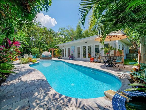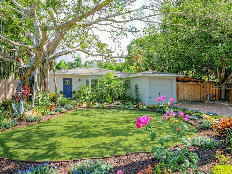 Absolutely charming inside and out! It's time to own a home that you never want to leave! Your dream backyard awaits with tropical foliage surrounding an amazing saltwater pool that can be both heated or chilled! The pool boasts Pebble Tec surface, sun shelf, polar plunge and waterfall! Enjoy the Florida lifestyle with easy-maintenance astroturf throughout the entire yard, plus a putting green, outdoor shower, fire pit, and dining trellis. Tastefully remodeled in 2015, the owners spared no expense while meticulously redesigning this Selby-like retreat. Stepping inside, you'll love all the charming features that makes this house a home. Abundant natural light greats you through the large windows and french doors. Original crown molding, natural bamboo wood floors and recessed shelving are just a few details that give the home its character. The adorable kitchen was lovingly designed in keeping with a 1950s era motif with retro style pink appliances, white subway tile, and boomerang style pulls. In the master bath, an artist installed whimsical mosaic tiles for a one-of-a-kind feature you won't find elsewhere! Opening from the master suite is an office, which could be converted into a third bedroom. The second bedroom is tucked away for privacy and features a stylish, painted wood accent wall. Off the living room is the second bath with frameless glass walk-in shower & designer glass tiles. Known as the Bamboo Bungalow, this charming home is centrally located in a desirable west-of-the-trail neighborhood-- 1 mile to Siesta Key, and 2 miles to downtown. Love where you live in this slice of paradise!