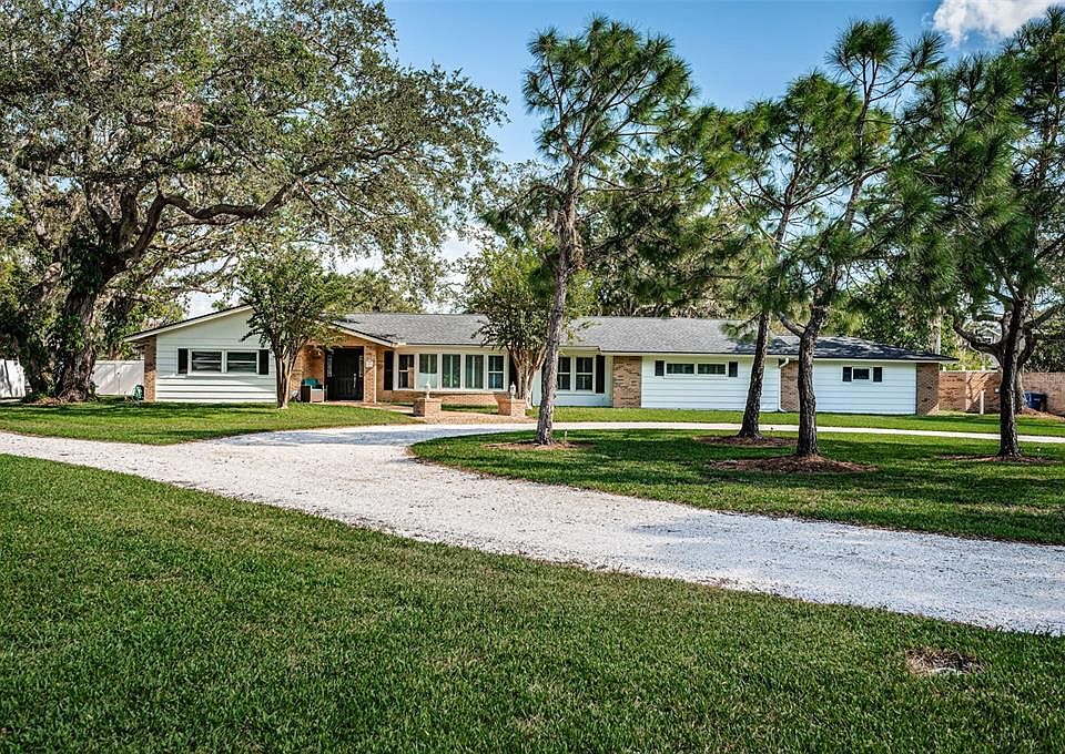 Spectacular private estate situated on 2.35 Acres of High and Dry land in Clearwater. Park like setting with manicured grounds and towering oaks offering peace and tranquility. Meticulously maintained and updated throughout the years, this home offers three bedrooms, three full baths, 3,604sf. of living area, formal living and dining rooms, Florida room and a beautiful Sunroom with exceptional views. To the rear of the property is a barn with a carport, garage, and air conditioned office space. Large updated kitchen with stainless steel Kitchenaid appliances, stone counters, custom cabinetry, and a large walk in pantry. The over 950sq. ft. primary ensuite features a gorgeous master bath with walk in shower, spa tub, two walk in closets, and a gas burning fireplace. Other features include: New Roofs, Two new A/C's, Natural Gas, Wood burning fireplace in family room, inside laundry room with washer and dryer, two car garage, two new gas tankless water heaters, freshly painted interior and exterior, Full RV hook up, well for irrigation, front gated entry, and so much more. Fabulous overall location, across the street from the 163 Acre Eagle Lake Park, close to the Gulf Beaches, Airports, Interstate, Schools, Restaurants, and shopping. This beautiful setting is like living in the Country with all the convenient aspects of City life right around the corner. Be sure to view the virtual tour and interactive floor plan.