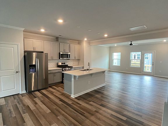 The first floor offers a private guest suite or home office, complete with a full bathroom perfect for visitors or work-from-home needs. Head upstairs to the second floor, where you'll find a bright and open living area with a seamless flow between the great room, dining space, and chef's kitchen. The kitchen is a standout, featuring high-end stainless steel appliances including a gas range, sleek cabinetry, granite countertops, and a large island perfect for entertaining. Step out onto the attached deck for fresh air or morning coffee.