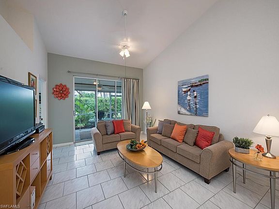 Soaring ceilings & light and bright private location makes this lovely 3 bed 2 bath 2 car garage villa a grand opportunity for maintenance free single family living. Yes, as a single family financing is a breeze. New roof and fresh paint are covered by association. Tile floors ,hurricane rated windows & shutters add to the appeal. The prime Naples location seals the deal: walk to shops & popular dining ,10 minutes to Old Naples & the beach. Take 10 steps and you are on a wonderful 3.7 mile walking trail. Did you see the grand community pool, deck & fishing dock overlooking the 37 acre lake ? How about the exercise room? Yes it is all included in your fee. Truly enjoy all Naples has to offer as a full time or snow bird residence without all the fuss. Available turnkey furnished. Simply bring a toothbrush. Be sure to see both virtual tours . See Remarks please.