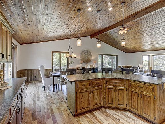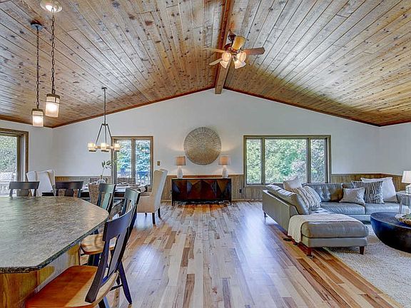 Beautiful 1.5 acre lot, spacious home, great price! 3 bedrooms, open floor plan great for entertaining or family living - the great room has a vaulted wood ceiling, lots of windows, and a stone fireplace. Gorgeous eat-in kitchen opens to the living area and the deck beyond for entertaining. Private main floor master suite with en-suite bath and sun/hot tub room. The finished walk out lower level offers a great family room area, natural fireplace, bar and 2 separate rooms - use for a work out space, office, etc. This home is warm and inviting, with wood, stone, and barn beams, but not overly rustic. Professionally landscaped plus a wonderful in-ground pool; very private setting surrounded by woods, many varieties of trees and garden areas. Addit detached 2 car garage 30x24 w/full bathroom.