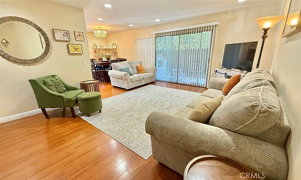 This bright and spacious END UNIT, lower-level condo includes three bedrooms and one and three-quarter bathrooms, thoughtfully designed with an open floor plan that makes entertaining and daily living effortless. The entry leads into a large living room and adjoining dining area, where sliding glass doors open to a private balcony. Attractive hardwood and tile flooring flow throughout, adding warmth and character to the home. New lighting fixtures such as the chandelier, hallway lights and recessed lighting add elegance to the home.