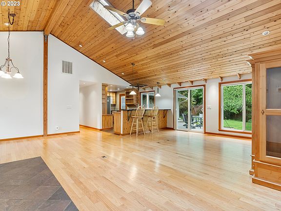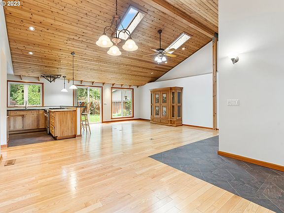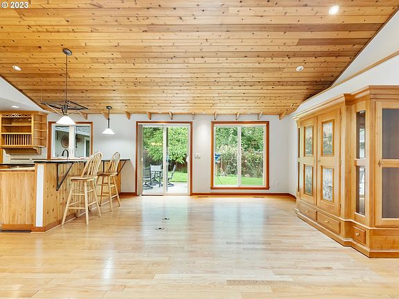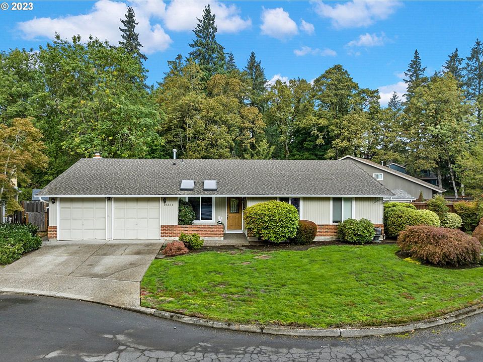 Among the trees in Lake Oswego! Single Level Ranch on a Cul de sac. Step into a welcoming great room w/vaulted cedar ceiling, open tiled kitchen and views to the private back yard. Kitchen w/granite & wood block counters, wood cabinets, gas range. A cozy den w/fireplace leads to a large family room w/sliding doors to backyard at one end of the house. Three bedrooms on the other side include the primary suite w/updated bath (heated floor, walk in shower). Bedroom/office with built ins and murphy bed. A highlight of the home is the fully fenced, park-like backyard with patio, tool shed, garden and established plantings. Perfect for entertaining, playing, pets and gardening. Fresh interior paint, new windows, AC unit, & thermostat in 2023. Bryant Woods community pool is at the entrance to the Cul de sac; the home backs up to community green space!