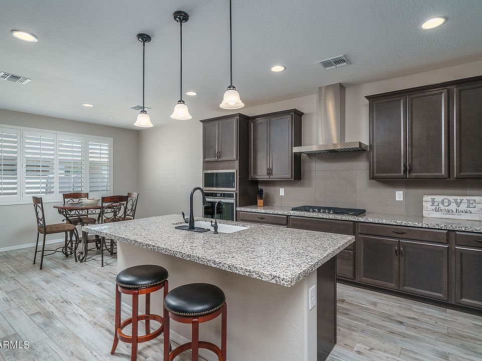 Welcome to your dream home in Azure Canyon! This impeccably designed 3-bedroom, 2.5 bathroom home has been highly upgraded with no detail overlooked. Neutral tones throughout the home are paired perfectly with shutters for a clean and inviting aesthetic. The gourmet kitchen has luxurious upgrades featuring granite countertops, tile backsplash, stainless steel wall appliances, gas cook top with a sleek hood, and a spacious kitchen island with a breakfast bar. Plus, a walk-in pantry and an R/O system. The primary suite is immaculate with a private door to the backyard, and a luxurious ensuite bathroom featuring a dual sink vanity, a tiled shower, and a walk-in closet that connects to the laundry room! Bedrooms 2 and 3 are spotless and share a jack-and-jill bathroom complete with shutter and ceiling fans. The backyard is huge! The home sits on a 7,150 SQFT lot across the street from the community greenbelt. The covered patio has extended paved seating area off the patio. Additional features include a water softener loop, a service door in the 3-car tandem garage, and steel security doors This home is equipped with all the necessary upgrades to provide both luxurious living and efficient functional space. You will not be disappointed.