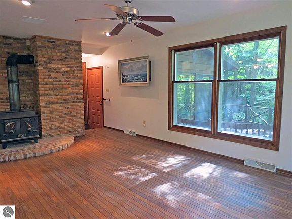 Access to the river in front of the home is gradual and very approachable. The large kitchen is very comfortable, and the windows off the living area bring plenty of the outside light and beauty in. One of the highlights of the house is the four-season room overlooking the woods and river just beyond. The two bedrooms upstairs as well as the master bedroom each have their own bathroom. Ample storage throughout including a walk-in closet off the master. Lower level is finished and is used as a game room. Home features geothermal heating/cooling (an efficient way to heat and cool the home; draws from the coolness of ground in the summer to keep home cool, and the warmth of the earth in the winter to keep home warm), plus a wood stove that can heat the entire home (two geothermal furnaces used for back-up). Oversized three-car garage has room for all your toys and then some. Landscaping features lots of native Michigan plants and a frog pond. Betsie River is designated as a Natural River by the Michigan DNR. Two miles to Crystal Mountain.