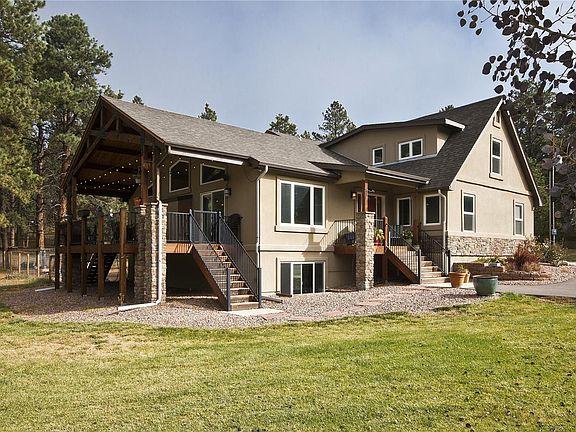 Beautiful home on large 2.5 acre wooded lot w/ easy access to the Denver Metro area as well as COS*Home recently updated & extended to lend a modern, open feel to a newly designed floor plan*Completely upgraded throughout*Kitchen boasts granite counters, deep-basin sink, wood floors, 42" custom made cabinetry, SS appliances & huge kitchen pantry*Mud room has built-ins for extra storage & high ceilings make this a bright and inviting space*Garage is a 3-car Tandem, is all finished and has service garage door*Driveway is wrap around Asphalt*Laundry has extra shelving dedicated space for your washer and dryer*Lots of flex spaces to include loft upstairs and library on main level*Fun indoor climbing wall/room in bment*Mbed is spacious w/ sitting area & en-suite into large 5-piece bathroom with tile floor, double vanities, granite counters & large W/I closet*Beautiful 400 sq. ft West facing covered deck w/ exposed Timber Trusses, wrought iron railings, trex decking