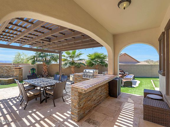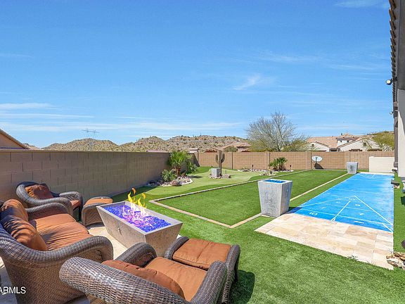 Extraordinary Vacation Home Nestled into the Estrella Mountainside! If you're looking for LUXURIOUS FUN, look no further! This executive David Weekley home on 1/3 acre features a heated pool and spa, built-in BBQ island and pergola, travertine patio with raised poolside lounge, stacked stone fountain, several gas fire pots, and sport courts in the side yard with shuffleboard, bocce ball and a putting green! At the heart of the home, a spacious kitchen with huge entertainer's island opens to the great room with raised ceiling. There's a media room with a wall to wall snack bar, mini fridge and game storage cabinets! Surround sound ceiling speakers! 4 bedrooms, each with walk-in closets and ceiling fans, and 3 FULL bathroom are divided into private wings of the home. The paver patio is flanked by a true 3 car split garage. A portico entrance leads to a courtyard and double wood door entrance to the home. Enhanced aesthetic features include wood beam at the home theatre, woven wood shades, lighted media niche at great room, and more. Speaking of aesthetics, you're going to love the views from these windows! This is a nice, private location with no homes directly behind and only one next door neighbor. ESTRELLA: is a Top-Ranking, Master Planned Community with Highly Rated Schools! HOA fees include FREE use of Lakes, Yacht Club Paddleboats, Sailboats & Kayaks! Starpointe Resident's Club a 24,000 sq ft recreation center with Waterpark, Gym, Lap Pool, Lakeside Grill Restaurant & Game Rooms! Presidio Resident's Club, an 18,500 sq ft recreation center new in 2017 with Heated Pool, Splash Pad, State-of-the-Art Work-Out Facility, Cantina Restaurant & Gourmet Demonstration Kitchen! Pickleball at neighborhood parks! FINS trail system in Estrella offers some of the Valley's best Hiking and Biking! Golf Club of Estrella is a Troon managed, Nicklaus Design golf course.