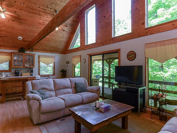 Cabin in the woods privately located on three wooded acres M/L. Located at the end of the cove, so no lake traffic here! Serene and peaceful, open floor plan with two large bedrooms and two full bathrooms.being sold completely finished. Deck wraps around the back, detached garage added in 2016 for all your laketoys and more! Loft area has the master bedroom and bathroom with a balcony overlooking the cove. Lakeviews are limited, but if you want private and quiet, this is it!! 10 x 24 boatslip located within golf cart ride away for additional $26K.